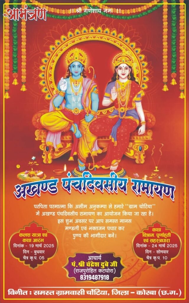 कटघोरा चोटिया—— कोरबा जिला के पोड़ी ब्लाक अंतर्गत ग्राम पंचायत चोटिया में हर वर्ष की भांति इस वर्ष भी पांच दिवसीय अखंड मानस गान का आयोजन किया गया है जो 19 मार्च से प्रारंभ हुई है, समिति के सदस्य मिश्रीलाल विंध्यराज ने बताया कि इस वर्ष पंचायत चुनाव के बाद से सरपंच प्रतिनिधि रायसिंह बिंदराज को पाकर पूरे ग्राम में खुशी का माहौल है, इस धार्मिक अनुष्ठान का संपादन आचार्य श्री चंद्रेश दुबे के सानिध्य में कथा प्रारंभ की गई है, इस अनुष्ठान में समस्त ग्रामवासी बढ़-चढ़कर भागीदारी निभा रहे हैं दूर दराज से आने वाले मानस मंडलियों के लिए ठहरने एवं भोजन की उत्तम व्यवस्था की गई है कथा विश्राम 24 मार्च दिन सोमवार को होगी अखंड मानस समिति चोटिया द्वारा अपील की गई है कि आम जनमानस कथा प्रेमी अधिक से अधिक संख्या में आकर अमृत रूपी कथा का श्रवण कर अपने जीवन को धन्य बनाएं,,