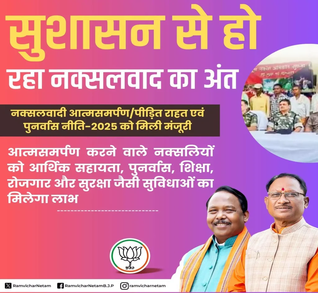 सुरक्षा और विकास से नक्सलवाद का अंत नक्सलवादी आत्मसमर्पण/पीड़ित राहत और पुनर्वास नीति-2025 को मिली मंजूरी राज्य सरकार ने नक्सलवाद से प्रभावित लोगों के लिए आत्मसमर्पण की नीति और पुनर्वास के लिए एक नई दिशा को मंजूरी दी है। इस नीति के तहत, आत्मसमर्पण करने वाले नक्सलवादियों को आर्थिक सहायता, पुनर्वास, शिक्षा, रोजगार और सुरक्षा जैसे प्रमुख लाभ प्रदान किए जाएंगे। इसके साथ ही, उन्हें समाज में समायोजन और विकास की दिशा में मदद मिलेगी।