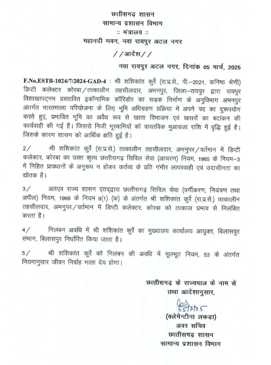 भारतमाला परियोजना में 324 करोड़ का भ्रष्टाचार !एसडीएम के बाद अब डिप्टी कलेक्टर शशिकांत कुर्रे सस्पेंड ,दो दिन में दो अफसरों पर कार्रवाई से मचा हड़कम्प