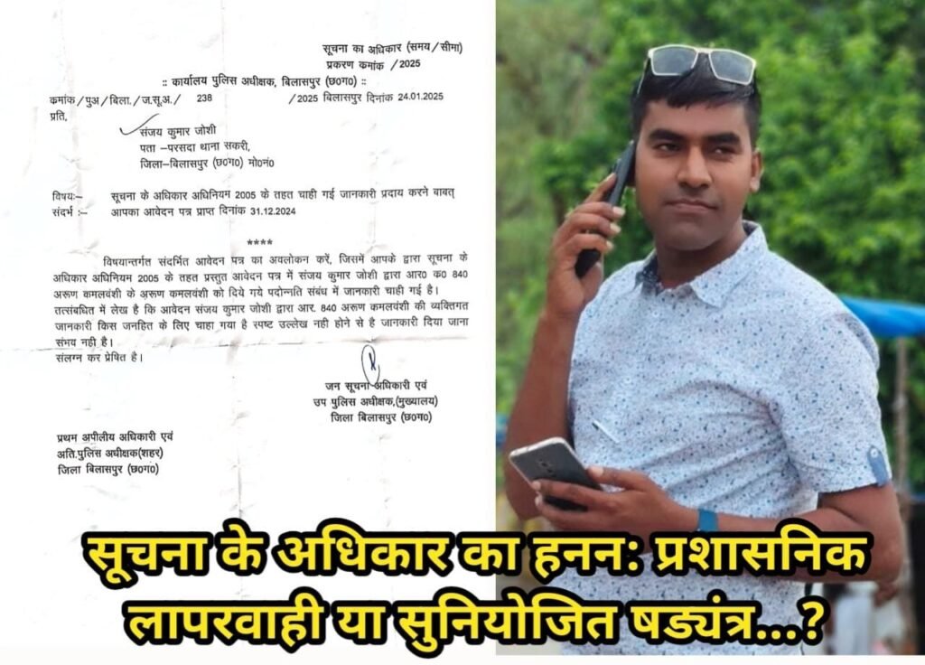 बिलासपुर। आरक्षक क्रमांक 840 अरुण कुमार कमलवंशी की पदोन्नति से जुड़ी जानकारी को लेकर दायर सूचना के अधिकार (RTI) आवेदन पर प्रशासन का टालमटोल और जवाब में देरी संजय जोशी के लिए संदेहास्पद बन गई है। उन्होंने आरोप लगाया कि बिलासपुर पुलिस अधीक्षक कार्यालय सहित अन्य संबंधित कार्यालय जानबूझकर आरोपी को संरक्षण दे रहे हैं और अपराधों को बचाने का प्रयास किया जा रहा है।